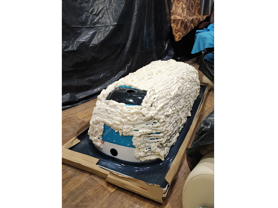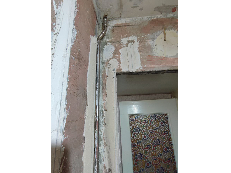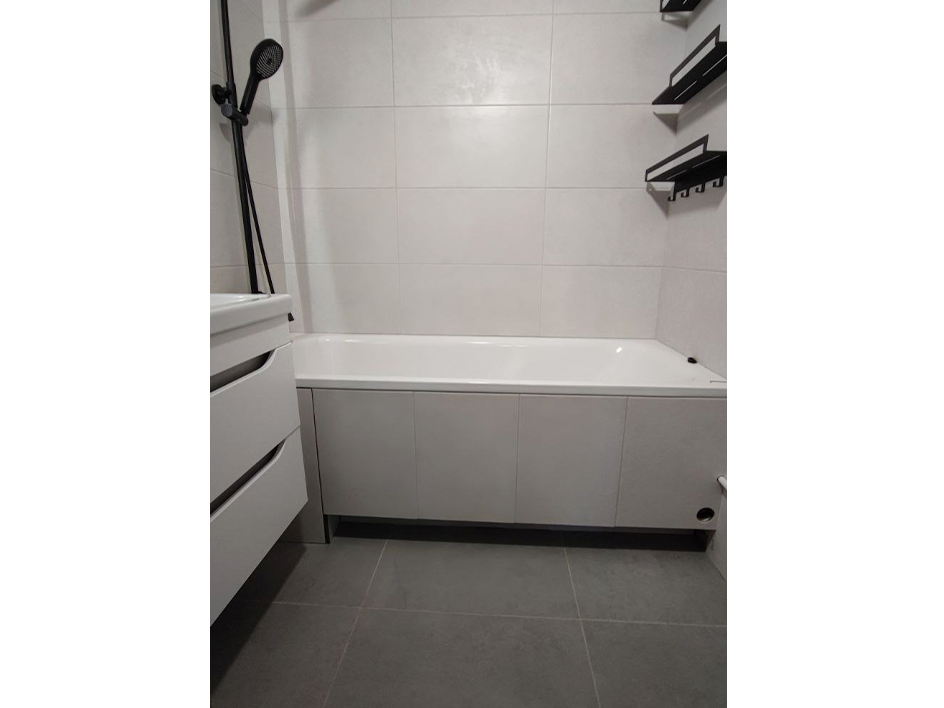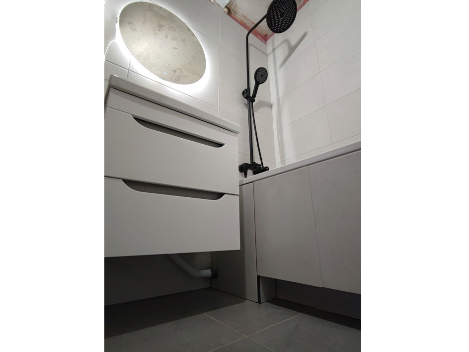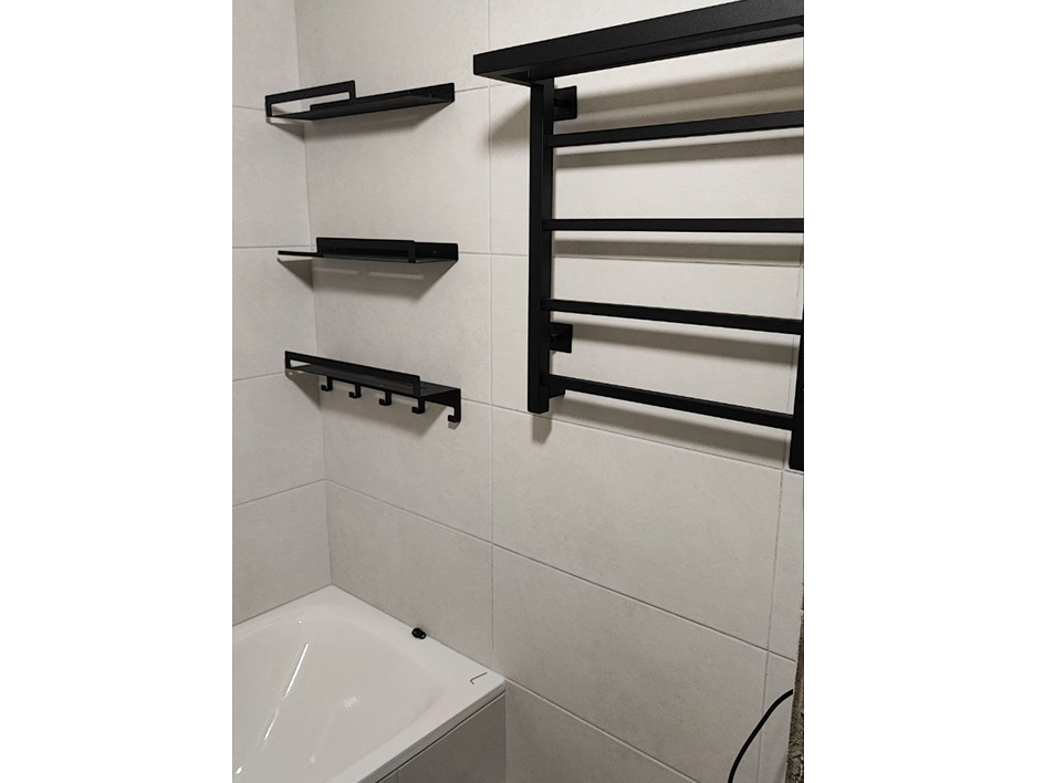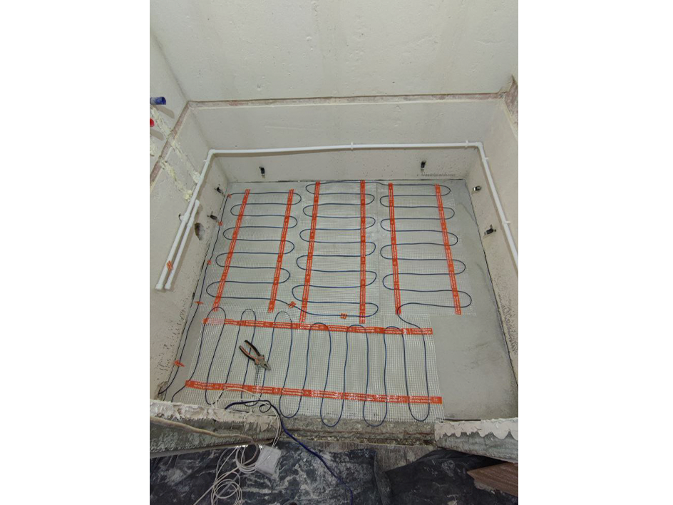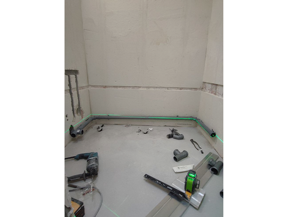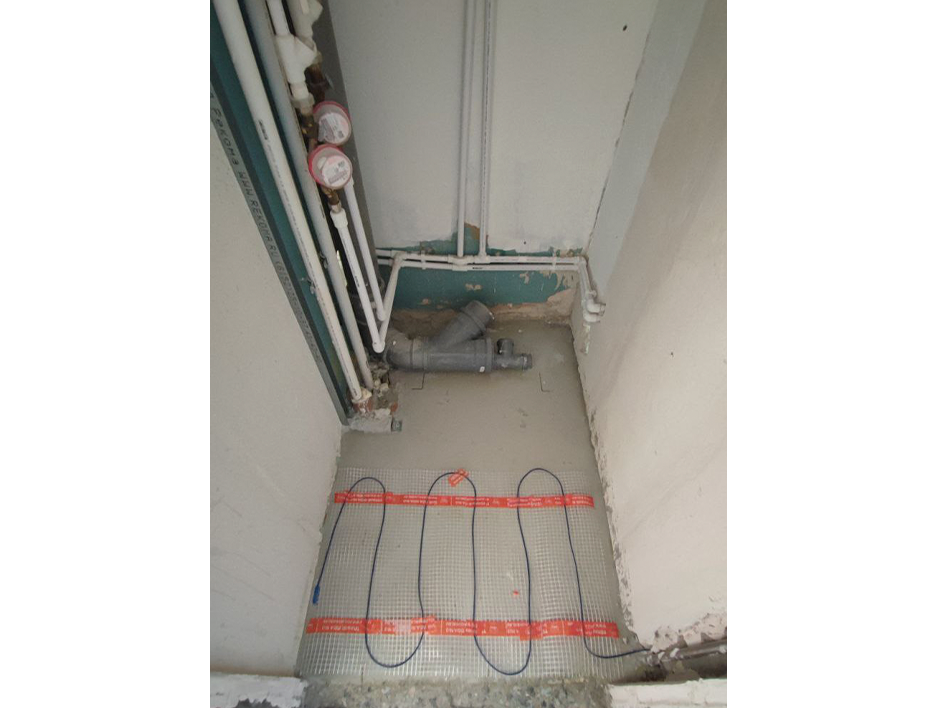 Стены очищены от лакокрасочного покрытия, загрунтованы, нанесён бетоноконтакт, выровнена геометрия. Подведена канализация, выполнена разводка ГВС и ХВС. Смонтирована инсталляция, зашили короба. Уложены маты теплого пола. Уложена плитка 30*60, швы затерты. Смонтированы унитаз, бойлер, душевой гарнитур. На бойлере добавили доп краны, для быстрого слива. Установлен предохранительный клапан, слив выведен в общую канализацию.