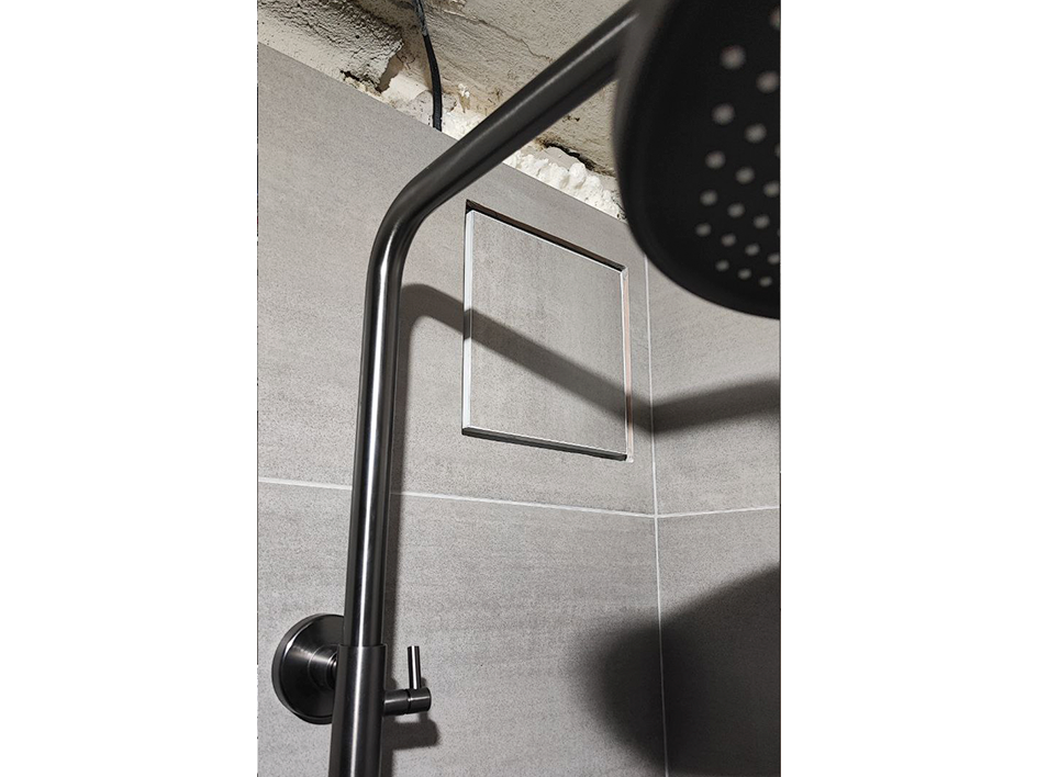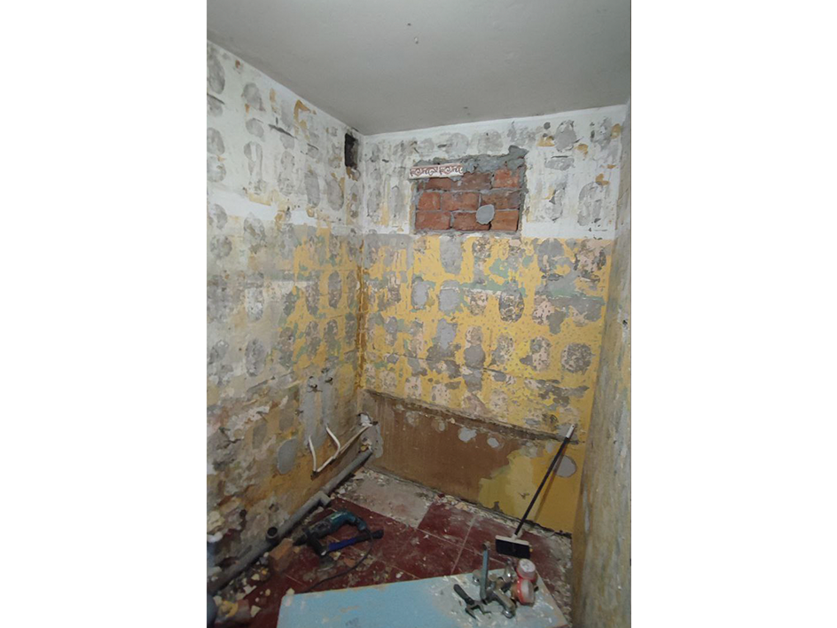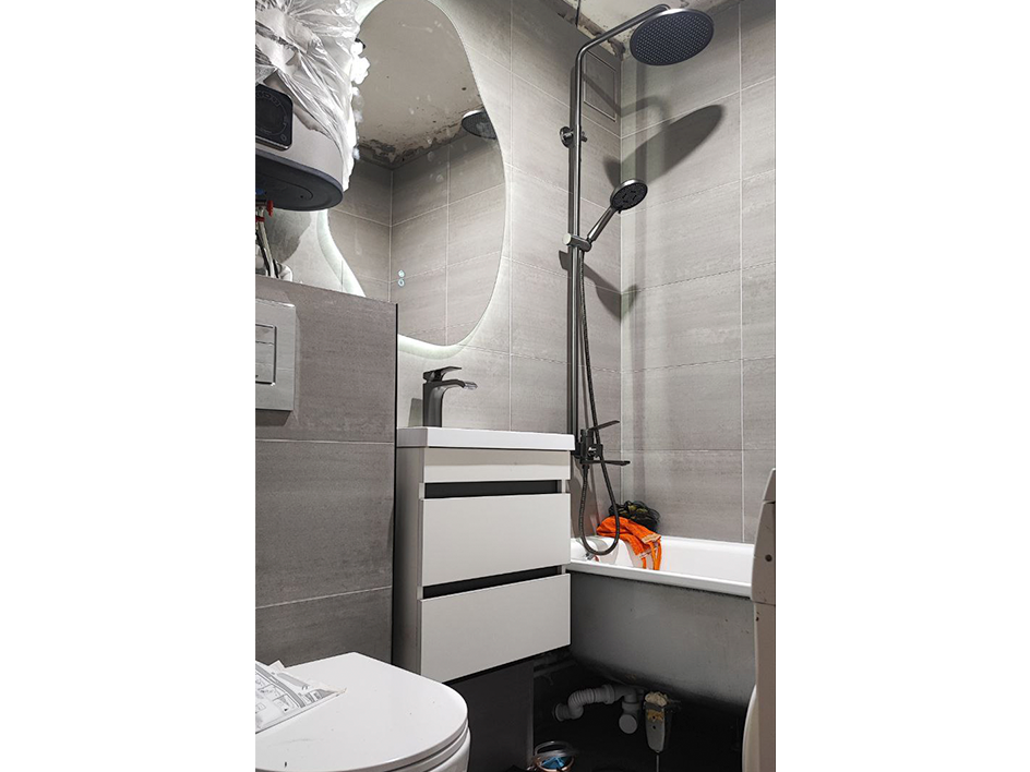 Выполнен полный демонтаж, частично снята штукатурка из-за крайне кривых стен, старая плитка держалась "на волоске", выровнена геометрия, всё загрунтовано. Скрытый монтаж трубы водяного полотенцесушителя и замена на электрический. Перенос вводных кранов на стояках. Скрытый монтаж вытяжки под плитку. Подведена канализация, выполнена разводка ГВС и ХВС. Смонтирована инсталляция. Уложена плитка 30*60, швы затерты. Смонтированы унитаз, бойлер, душевой гарнитур. На бойлере добавили доп краны, для быстрого слива. Установлен предохранительный клапан, слив выведен в общую канализацию.